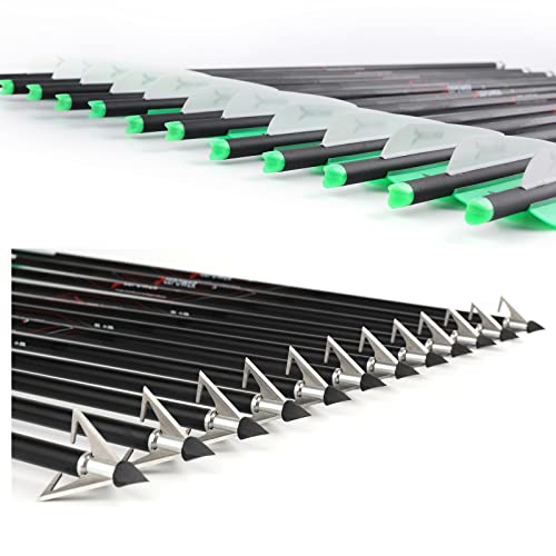 DEEPOWER Crossbow Bolts 20 22 Inch Carbon Archery Arrows Hunting with 4 inch Vanes 12 Pack and 12 Pack Hunting 3 Blade Broadheads kit for Archery Practise Hunting Crossbow Arrows
