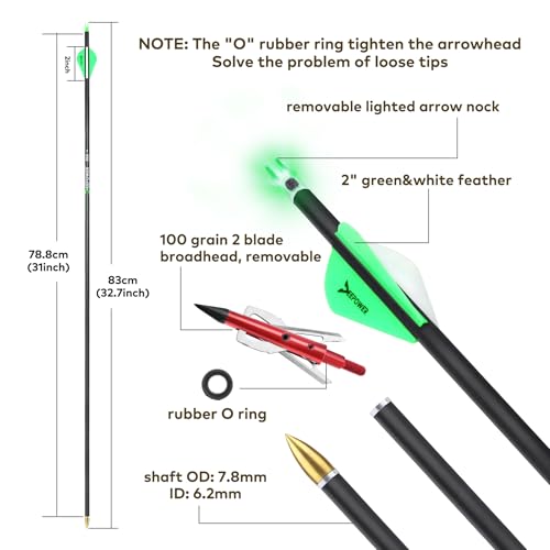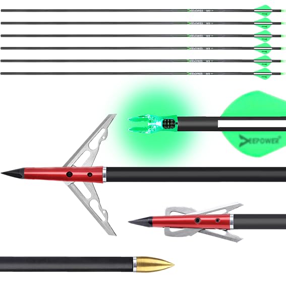 DEEPOWER 6 Pack 31-inch Carbon Arrows with Mechanical Broadheads and Lighted Nocks for Compound Bow and Recurve Bow